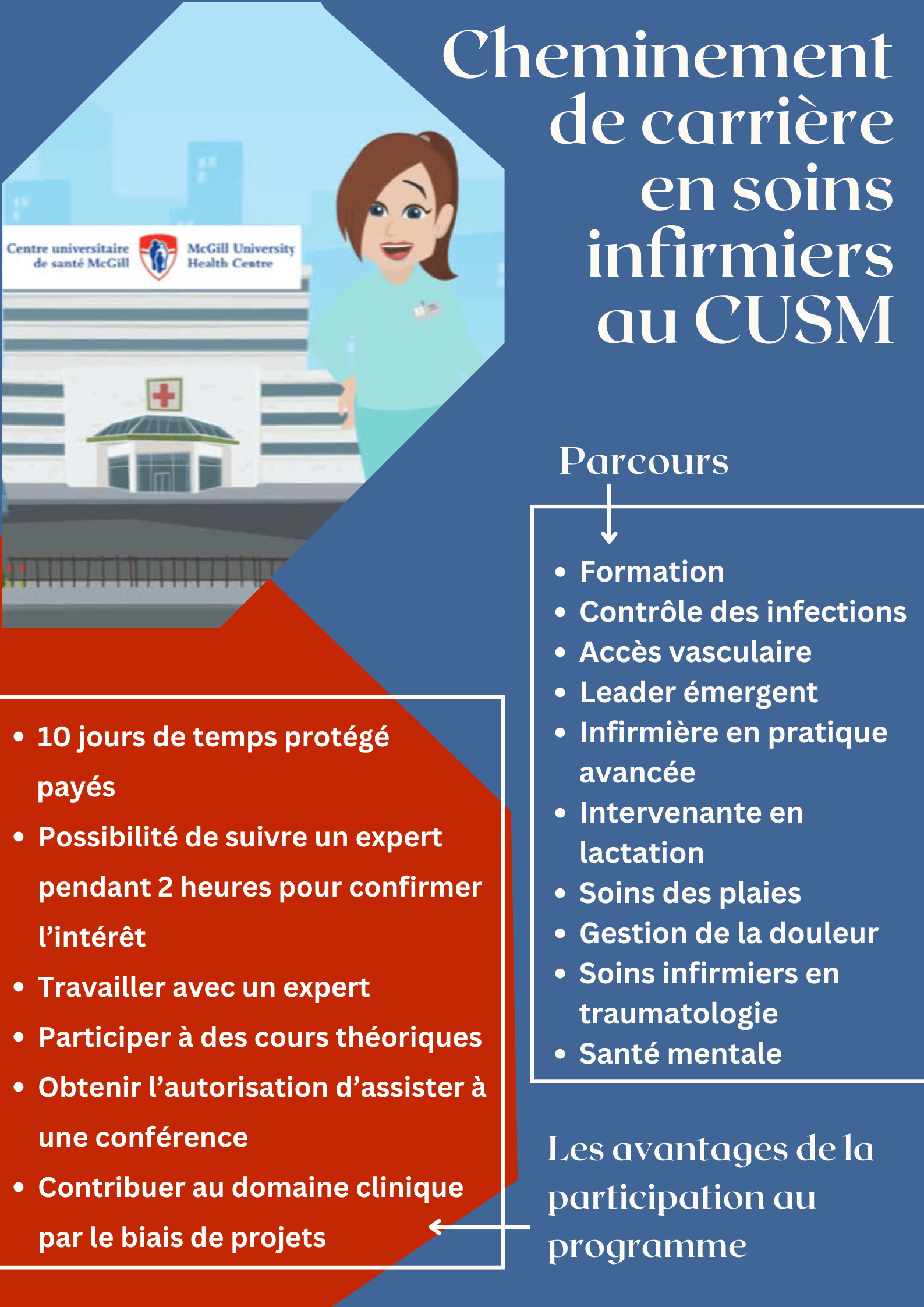 - Cheminement de carrière : soutient le développement professionnel des infirmières d’expérience (2 ans et plus) qui souhaitent explorer de nouveaux rôles en soins infirmiers. Offrant 10 parcours spécialisés, il favorise le développement des compétences cliniques, de l’autonomie et de l’engagement.
