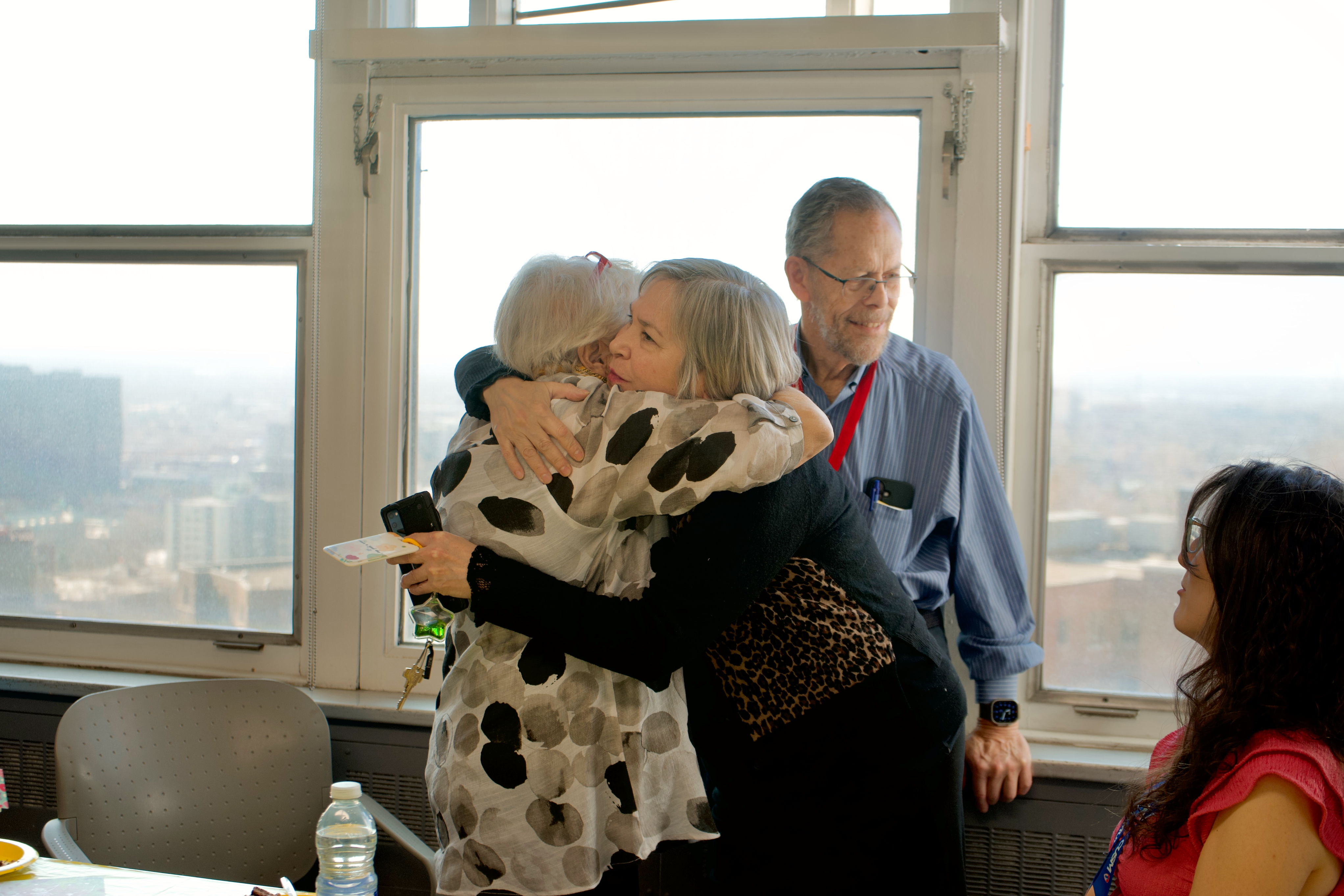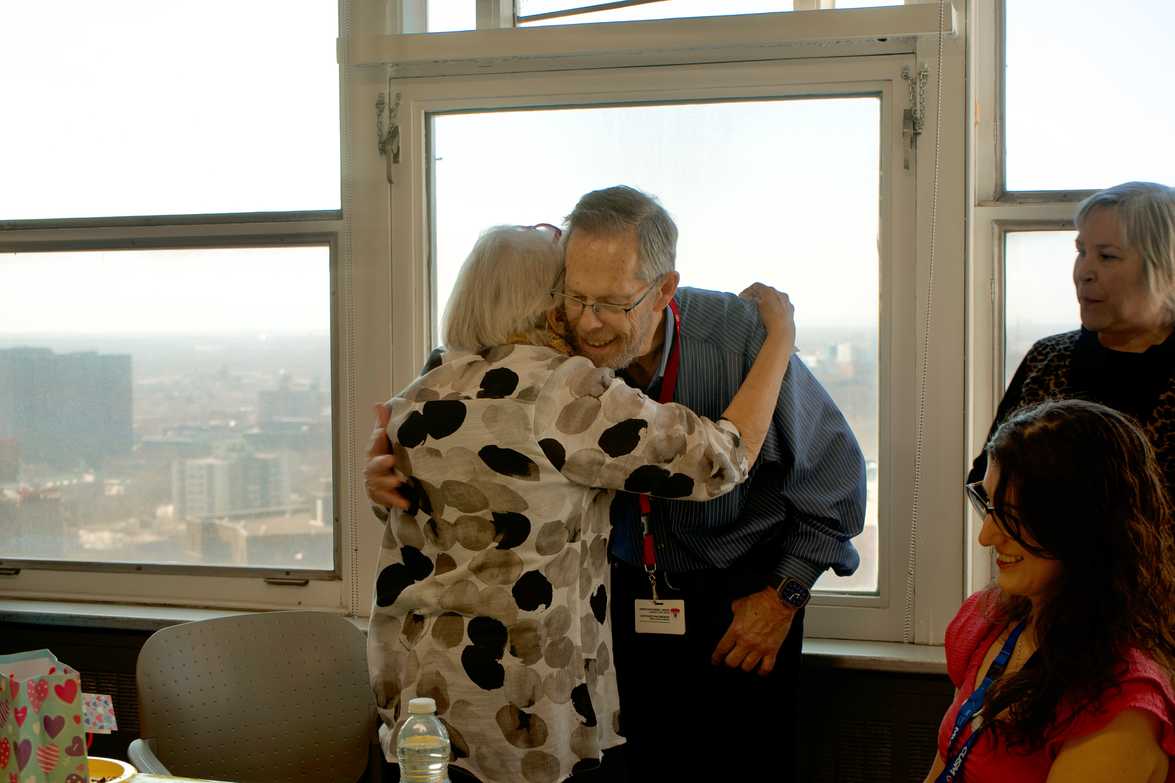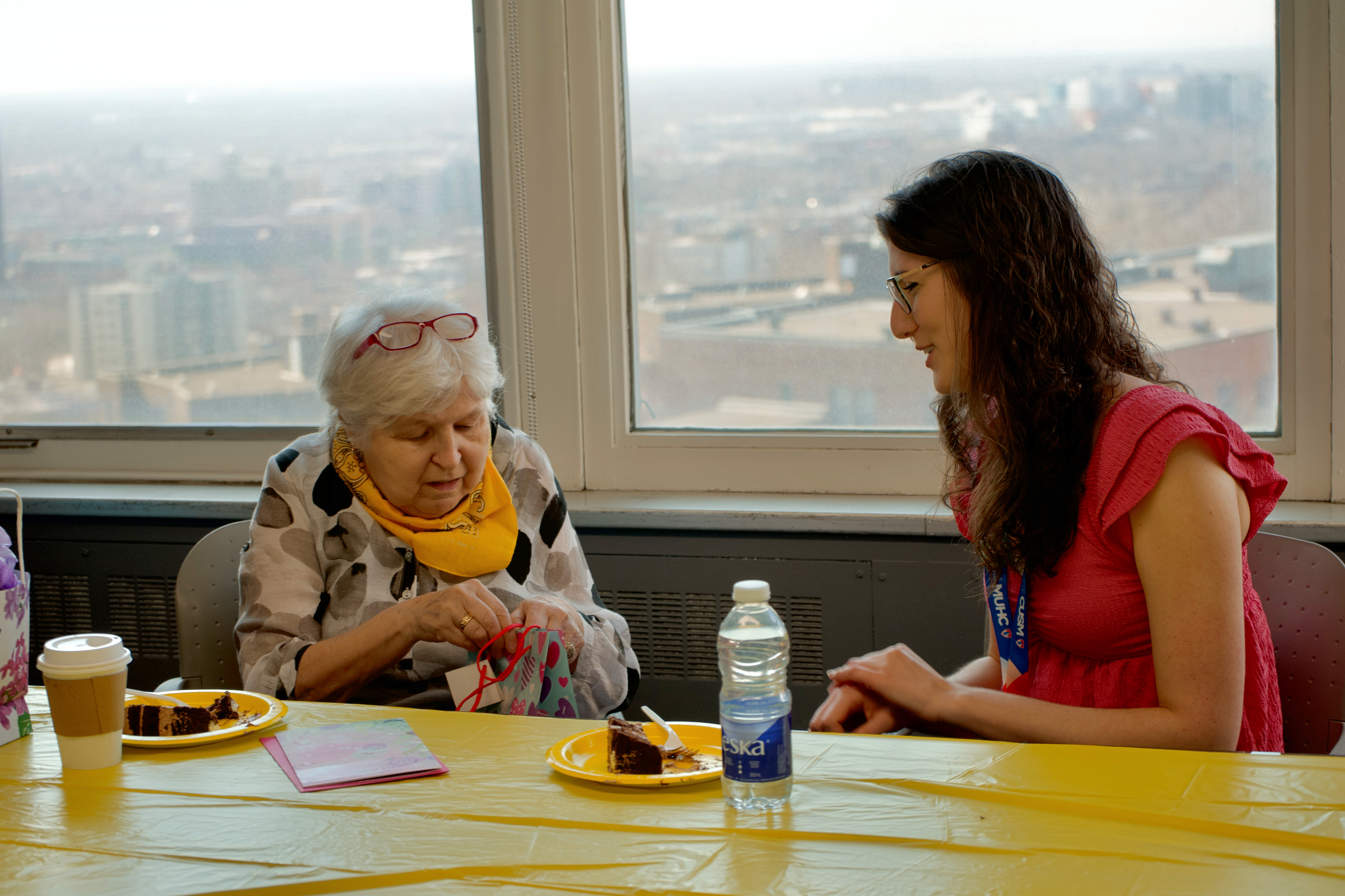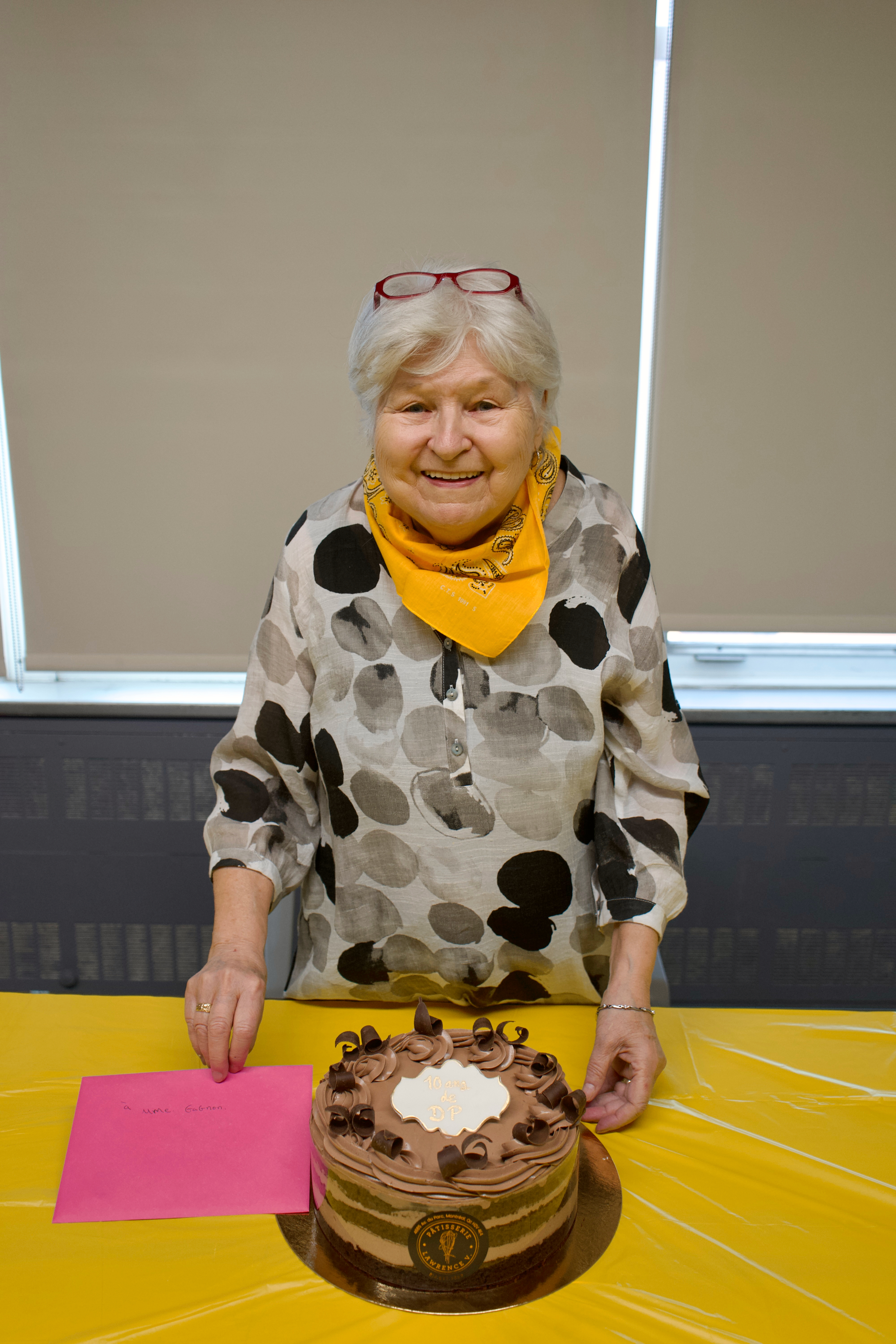 La lumière jaune du soleil entrait à flots par les grandes fenêtres vitrées de l’Hôpital général de Montréal, en amenant avec elle l’espoir du printemps… et le jaune se trouve justement être la couleur préférée de Madame Gagnon. Un gâteau au chocolat a été partagé entre la famille, ses amis et l’équipe soignante qui l’accompagne.