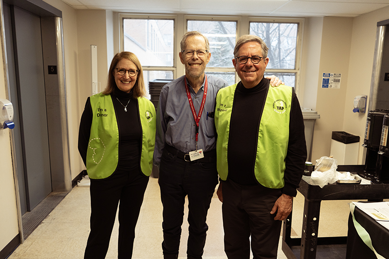 Installée à proximité de la clinique de protection rénale, la table d’information de Serge et Christine a également attiré la visite de l’ancien néphrologue traitant de Serge, le Dr Murray Vasilevsky qui l’a suivi pendant plus de 20 ans au CUSM — une rencontre marquée par beaucoup d’émotion.