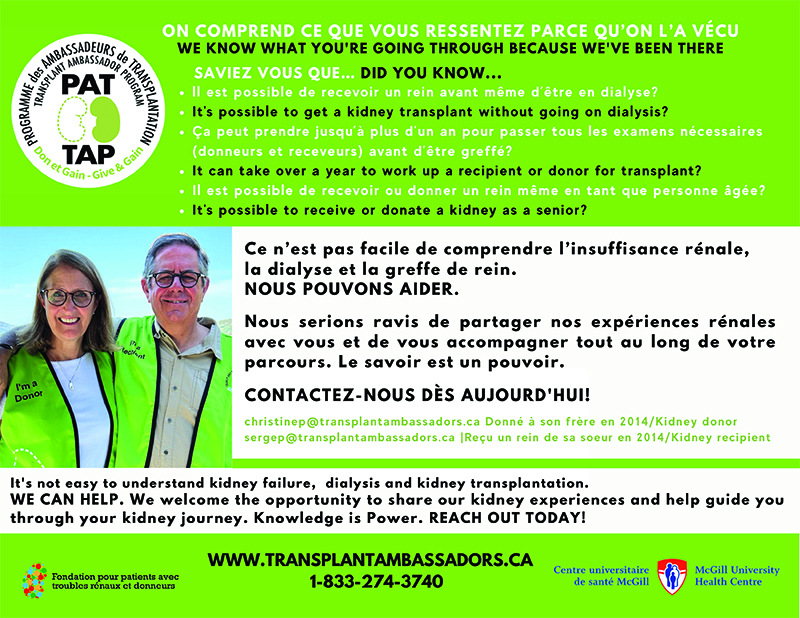 Déjà bien implanté dans le système de santé de l’Ontario, le programme se déploie pour une première au Québec, en commençant par l’Hôpital général de Montréal. Le PAT met en relation des patients atteints de maladie rénale chronique et leurs proches avec des mentors (ambassadeurs) ayant eux-mêmes vécu une expérience de don ou de greffe de rein.