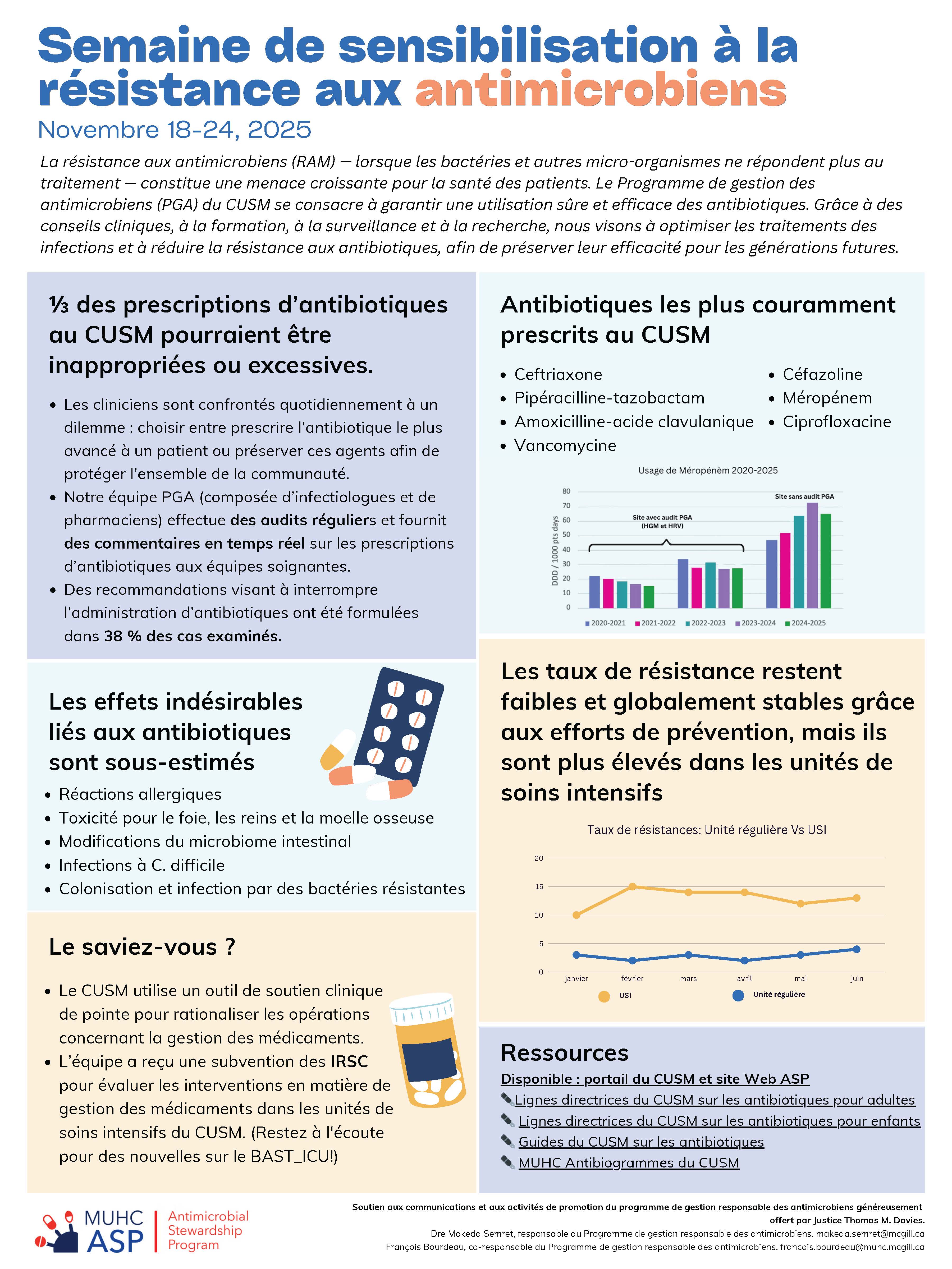 Au Centre universitaire de santé McGill (CUSM), le Programme de gestion des antimicrobiens (PGA) est au cœur de la lutte contre ce phénomène. Son objectif : assurer une utilisation sûre, efficace et raisonnée des antibiotiques, grâce à la formation, la recherche, la surveillance et le soutien clinique.